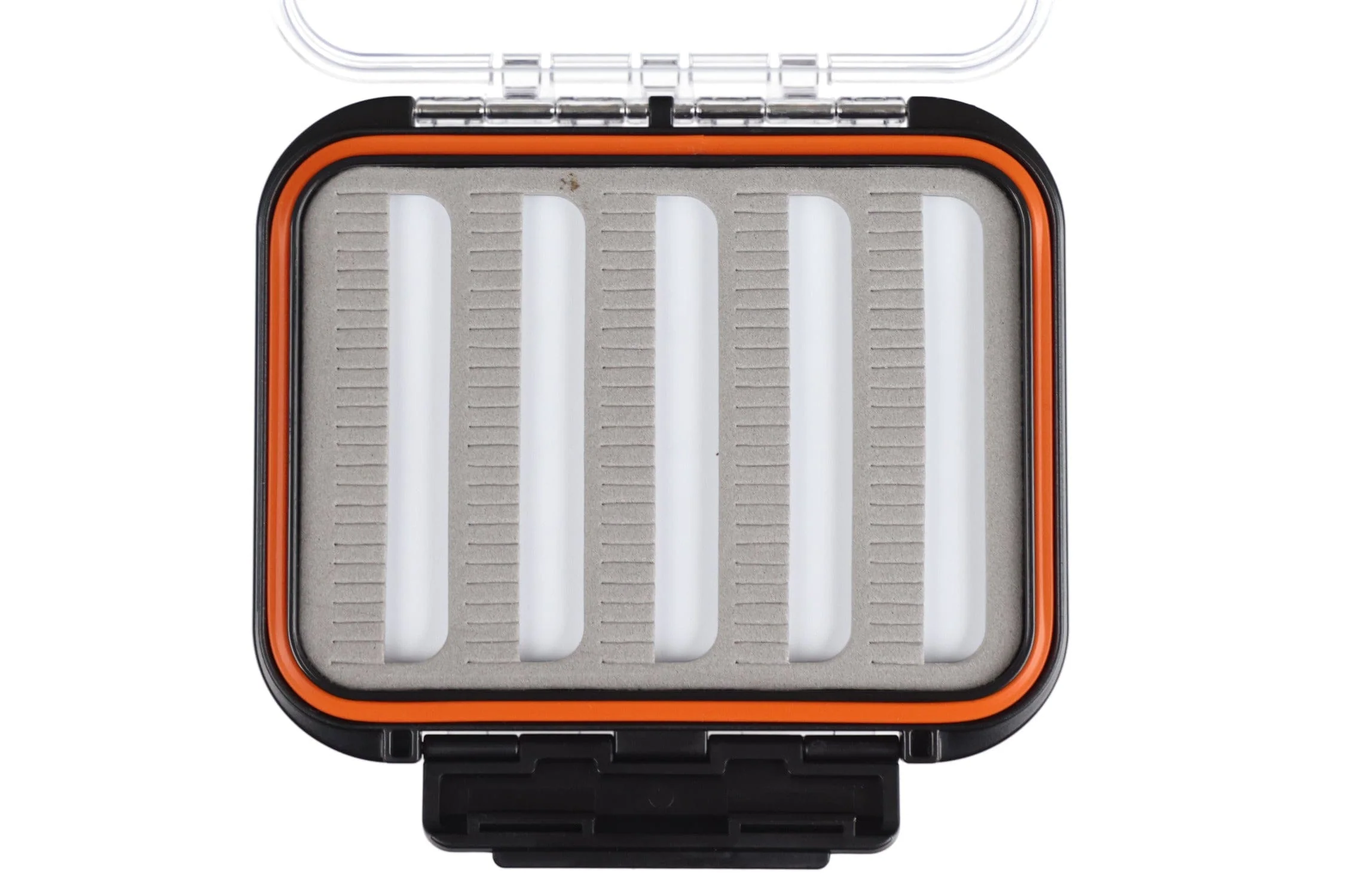 The Kennebec Fly Box is an essential box for any serious angler. Measuring at 5in x 4.25 in x 1.5 in, this medium-sized, double-sided box is expertly designed to maximize storage and organization. Its slotted foam liner securely holds a wide range of flies, ensuring they remain in place on the water and in your bag. The box is fully waterproof, featuring an orange rubber seal that provides an extra layer of protection against moisture, keeping your flies dry in any weather condition. The combination of its practical size, efficient design, and striking appearance, with the distinctive orange seal, makes the Kennebec Fly Box a standout choice.